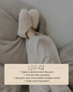 We leven in een wereld vol prikkels: geluid, schermen, verwachtingen, sociale druk. Als je weinig echte rustmomenten hebt, raakt je zenuwstelsel overbelast. Je hoofd voelt vol, je lontje wordt korter en zelfs kleine dingen kunnen te veel zijn.